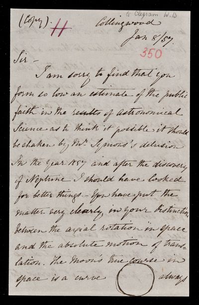 Draft letter, from Sir John Herschel to W. B. Clegram, dated at Collingwood