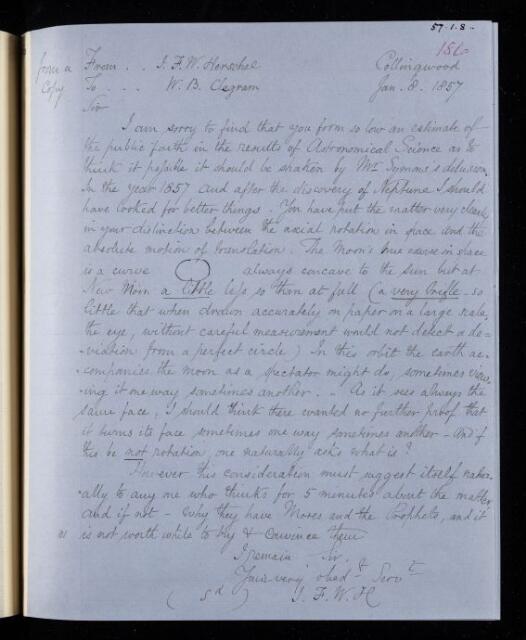 John Frederick William Herschel, Sir; John Frederick William Herschel, Copy of draft letter, from Sir John Herschel to W. B. Clegram, dated at Collingwood, 8 January 1857, HS/23/186, The Royal Society Archives, London, https://makingscience.royalsociety.org/items/hs_23_186/copy-of-draft-letter-from-sir-john-herschel-to-w-b-clegram-dated-at-collingwood, accessed on 08 November 2025