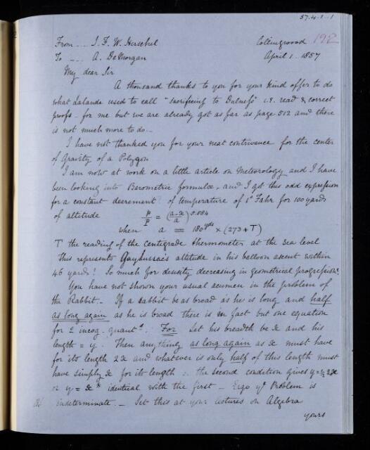 John Frederick William Herschel, Copy letter, from Sir John Herschel to Augustus De Morgan, dated at Collingwood, 1 April 1857, HS/23/192, The Royal Society Archives, London, https://makingscience.royalsociety.org/items/hs_23_192/copy-letter-from-sir-john-herschel-to-augustus-de-morgan-dated-at-collingwood, accessed on 17 December 2025