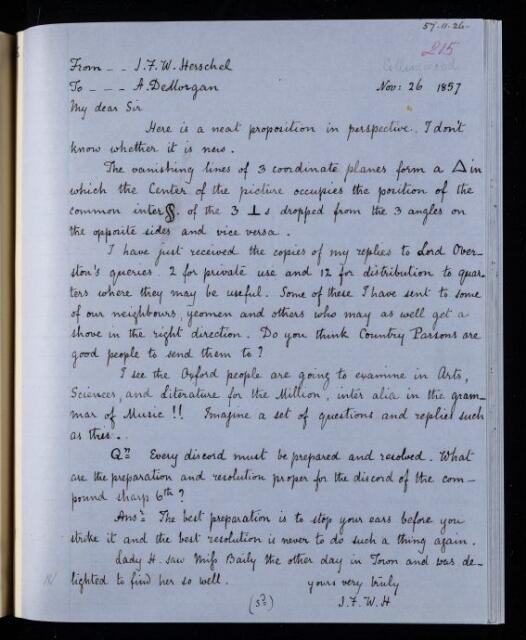 John Frederick William Herschel, Copy letter, from Sir John Herschel to Augustus De Morgan, 26 November 1857, HS/23/215, The Royal Society Archives, London, https://makingscience.royalsociety.org/items/hs_23_215/copy-letter-from-sir-john-herschel-to-augustus-de-morgan, accessed on 14 March 2026