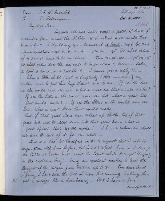 John Frederick William Herschel, Sir; John Frederick William Herschel, Copy letter, from Sir John Herschel to Augustus De Morgan, dated at Collingwood, 13 October 1858, HS/23/243, The Royal Society Archives, London, https://makingscience.royalsociety.org/items/hs_23_243/copy-letter-from-sir-john-herschel-to-augustus-de-morgan-dated-at-collingwood, accessed on 08 November 2025