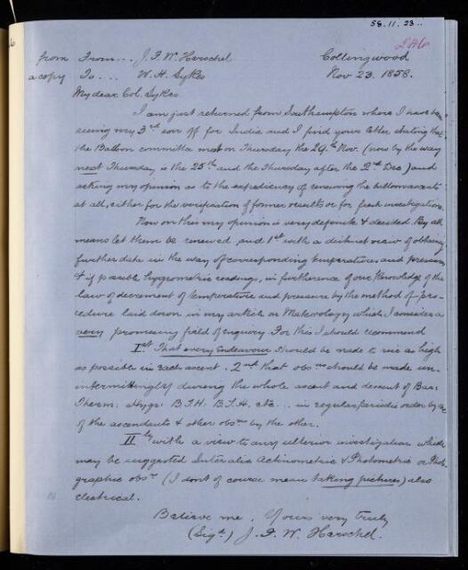 John Frederick William Herschel, Copy letter, from Sir John Herschel to William Henry Sykes, dated at Collingwood, 23 November 1858, HS/23/246, The Royal Society Archives, London, https://makingscience.royalsociety.org/items/hs_23_246/copy-letter-from-sir-john-herschel-to-william-henry-sykes-dated-at-collingwood, accessed on 07 February 2026