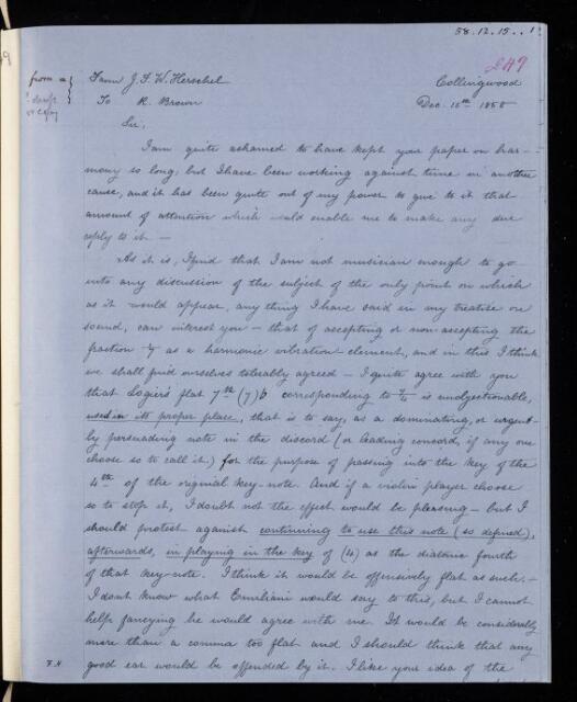 John Frederick William Herschel, Sir; John Frederick William Herschel, Copy of draft letter, from Sir John Herschel to Robert Brown, dated at Collingwood, 15 December 1858, HS/23/249, The Royal Society Archives, London, https://makingscience.royalsociety.org/items/hs_23_249/copy-of-draft-letter-from-sir-john-herschel-to-robert-brown-dated-at-collingwood, accessed on 08 November 2025