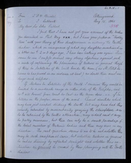 John Frederick William Herschel, Sir; John Frederick William Herschel, Copy letter, from Sir John Herschel to John William Lubbock, dated at Collingwood, 15 August 1861, HS/23/338, The Royal Society Archives, London, https://makingscience.royalsociety.org/items/hs_23_338/copy-letter-from-sir-john-herschel-to-john-william-lubbock-dated-at-collingwood, accessed on 13 November 2025