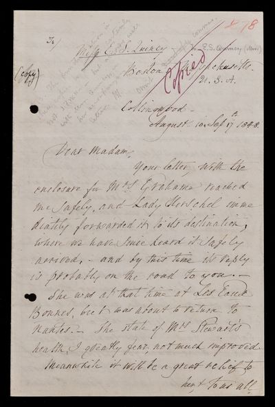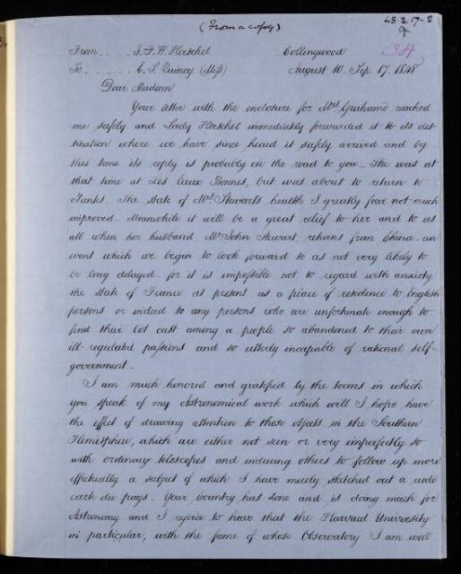 John Frederick William Herschel, Copy letter, from Sir John Herschel to Eliza Susan Quincy, dated at Collingwood, 17 September 1848, HS/23/34, The Royal Society Archives, London, https://makingscience.royalsociety.org/items/hs_23_34/copy-letter-from-sir-john-herschel-to-eliza-susan-quincy-dated-at-collingwood, accessed on 10 December 2025