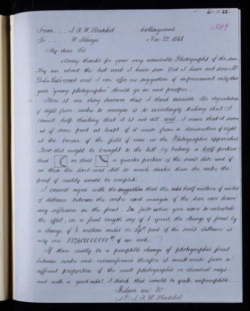 John Frederick William Herschel, Sir; John Frederick William Herschel, Copy letter, from Sir John Herschel to William Selwyn, dated at Collingwood, 22 November 1861, HS/23/349, The Royal Society Archives, London, https://makingscience.royalsociety.org/items/hs_23_349/copy-letter-from-sir-john-herschel-to-william-selwyn-dated-at-collingwood, accessed on 07 November 2025