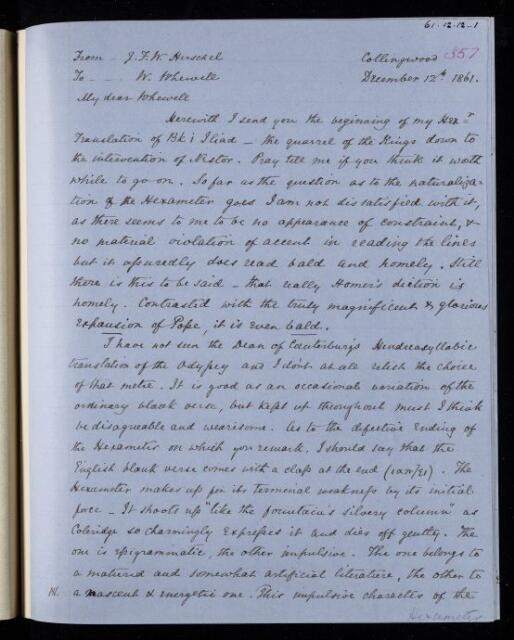 Copy of letter, copied as part of the correspondence project led by Colonel John Herschel FRS following the death of his father. Asks William Whewell's opinion of John Frederick William Herschel's hexameter translation of the opening section of Homer's Iliad. Comments on the value of hexameter verse.