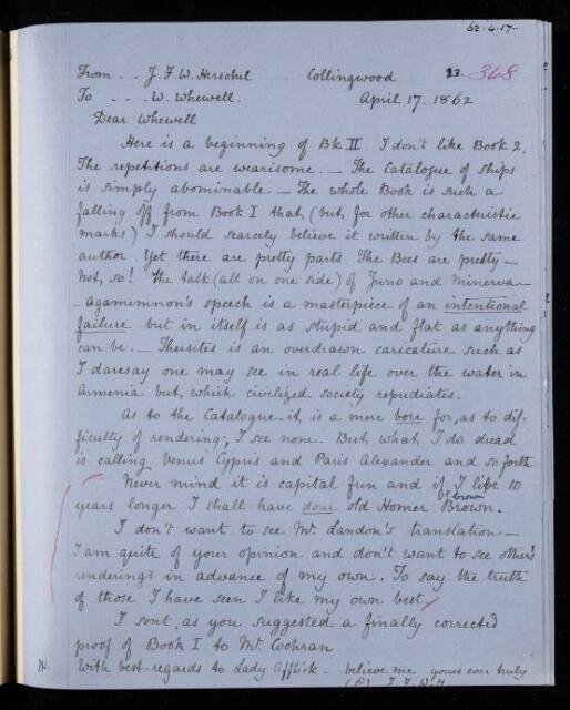 John Frederick William Herschel, Copy letter, from Sir John Herschel to William Whewell, dated at Collingwood, 17 April 1862, HS/23/368, The Royal Society Archives, London, https://makingscience.royalsociety.org/items/hs_23_368/copy-letter-from-sir-john-herschel-to-william-whewell-dated-at-collingwood, accessed on 12 February 2026