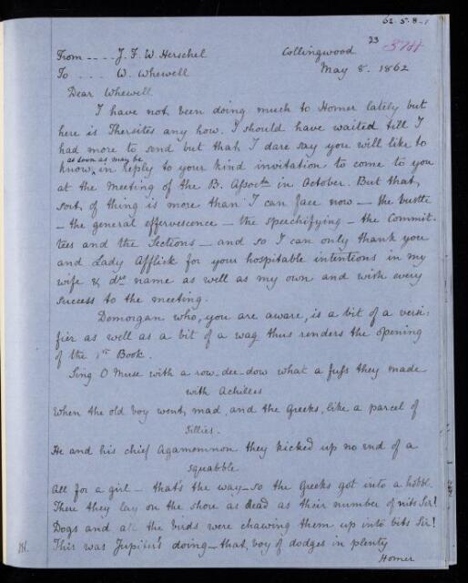John Frederick William Herschel, Sir; John Frederick William Herschel, Copy letter, from Sir John Herschel to William Whewell, dated at Collingwood, 8 May 1862, HS/23/374, The Royal Society Archives, London, https://makingscience.royalsociety.org/items/hs_23_374/copy-letter-from-sir-john-herschel-to-william-whewell-dated-at-collingwood, accessed on 12 November 2025