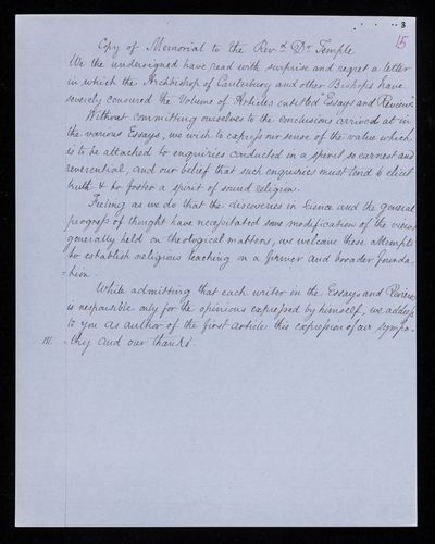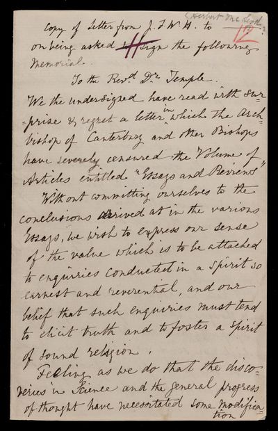 Copy of a letter, copied as part of the correspondence project led by Colonel John Herschel FRS following the death of his father. Reasons why he is unable to sign the Memorial to the bishops regarding their attitude to Essays and Reviews.