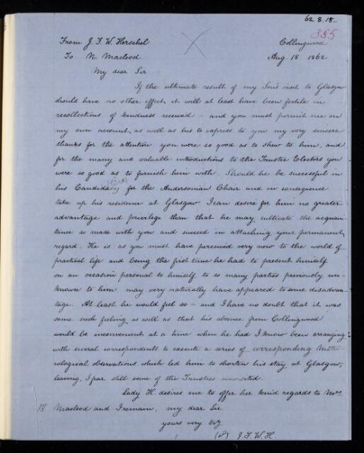 Copy letter, from Sir John Herschel to Herbert McLeod