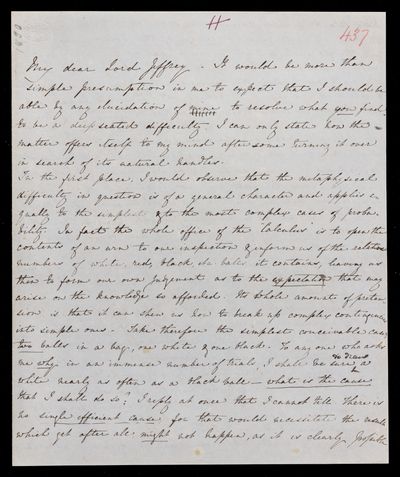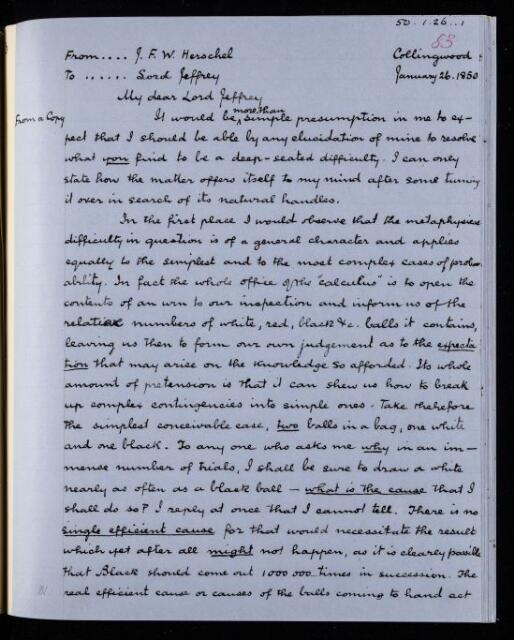 Copy of letter, copied as part of the correspondence project led by Colonel John Herschel FRS following the death of his father. Explaining his own idea of probability. [This appears to be the original, which was never sent as Lord Jeffrey died 1850-1-25.]