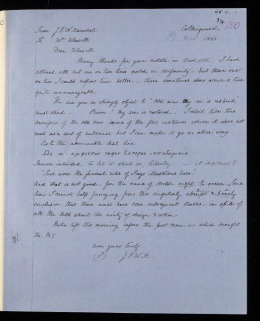 Copy of letter, copied as part of the correspondence project led by Colonel John Herschel FRS following the death of his father. Thanks William Whewell for and comments on his suggestions on John Frederick William Herschel's translation of Book XXIV of Homer's Iliad.