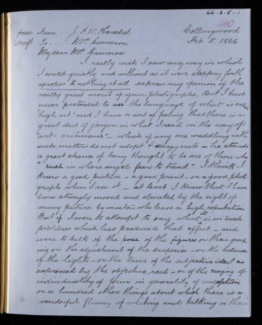 John Frederick William Herschel, Copy of draft letter, from Sir John Herschel to Julia Margaret Cameron, dated at Collingwood, 5 February 1866, HS/24/140, The Royal Society Archives, London, https://makingscience.royalsociety.org/items/hs_24_140/copy-of-draft-letter-from-sir-john-herschel-to-julia-margaret-cameron-dated-at-collingwood, accessed on 07 March 2026