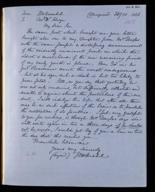 John Frederick William Herschel, Sir; John Frederick William Herschel, Copy letter, from Sir John Herschel to William Selwyn, dated at Collingwood, 26 February 1866, HS/24/143, The Royal Society Archives, London, https://makingscience.royalsociety.org/items/hs_24_143/copy-letter-from-sir-john-herschel-to-william-selwyn-dated-at-collingwood, accessed on 10 November 2025