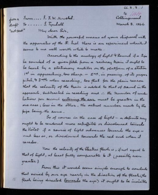John Frederick William Herschel, Copy of draft letter, from Sir John Herschel to John Tyndall, 3 March 1866, HS/24/144, The Royal Society Archives, London, https://makingscience.royalsociety.org/items/hs_24_144/copy-of-draft-letter-from-sir-john-herschel-to-john-tyndall, accessed on 14 December 2025