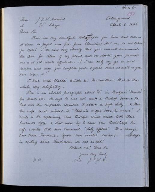 John Frederick William Herschel, Copy letter, from Sir John Herschel to William Selwyn, dated at Collingwood, 6 April 1866, HS/24/151, The Royal Society Archives, London, https://makingscience.royalsociety.org/items/hs_24_151/copy-letter-from-sir-john-herschel-to-william-selwyn-dated-at-collingwood, accessed on 10 December 2025