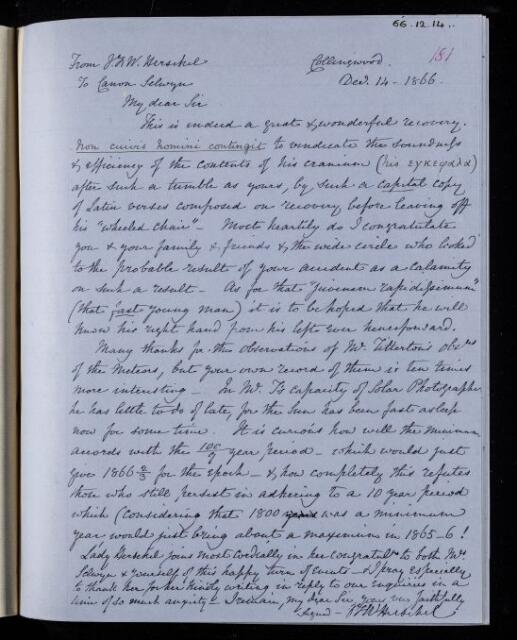 John Frederick William Herschel, Copy letter, from Sir John Herschel to William Selwyn, dated at Collingwood, 14 December 1866, HS/24/181, The Royal Society Archives, London, https://makingscience.royalsociety.org/items/hs_24_181/copy-letter-from-sir-john-herschel-to-william-selwyn-dated-at-collingwood, accessed on 10 December 2025