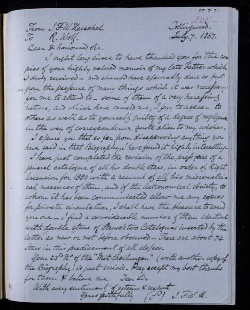 John Frederick William Herschel, Copy letter, from Sir John Herschel to Rudolf Wolf, dated at Collingwood, 7 July 1867, HS/24/202, The Royal Society Archives, London, https://makingscience.royalsociety.org/items/hs_24_202/copy-letter-from-sir-john-herschel-to-rudolf-wolf-dated-at-collingwood, accessed on 06 December 2025