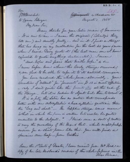 Copy of a letter. Thanks William Selwyn for 'Genevieve' translation. Will not continue the Dante because a Terza Rima translation has been done previously. The sun is behaving oddly.