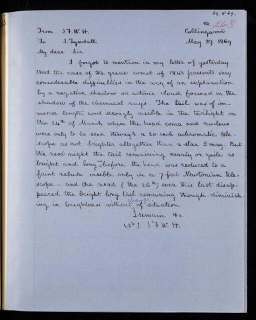Copy of letter, copied as part of the correspondence project led by Colonel John Herschel FRS following the death of his father. 'Great Comet of 1843' presents difficulties for John Tyndall's explanation of comets' tails [continuation of John Frederick William Herschel's 1869-5-28].