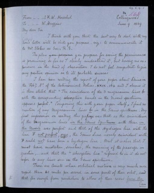 John Frederick William Herschel, Copy letter, from Sir John Herschel to Sir William Huggins, dated at Collingwood, 9 June 1869, HS/24/268, The Royal Society Archives, London, https://makingscience.royalsociety.org/items/hs_24_268/copy-letter-from-sir-john-herschel-to-sir-william-huggins-dated-at-collingwood, accessed on 17 April 2026