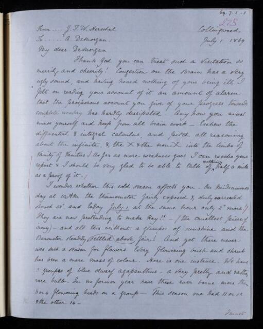 John Frederick William Herschel, Copy letter, from Sir John Herschel to Augustus De Morgan, dated at Collingwood, 1 July 1869, HS/24/273, The Royal Society Archives, London, https://makingscience.royalsociety.org/items/hs_24_273/copy-letter-from-sir-john-herschel-to-augustus-de-morgan-dated-at-collingwood, accessed on 07 February 2026