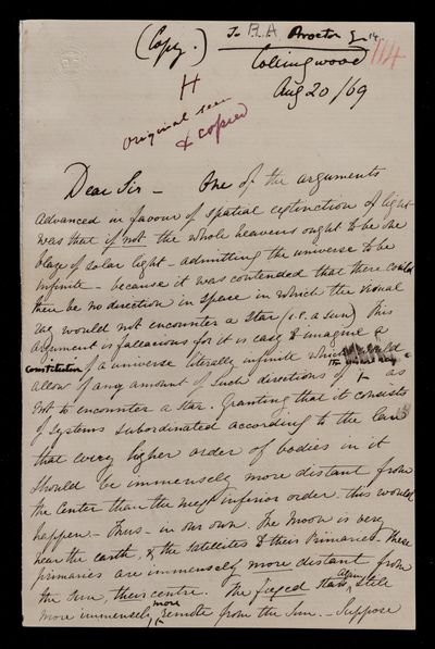 John Frederick William Herschel, Copy letter, from Sir John Herschel to Richard Anthony Proctor, dated at Collingwood, 20 August 1869, HS/24/277, The Royal Society Archives, London, https://makingscience.royalsociety.org/items/hs_24_277/copy-letter-from-sir-john-herschel-to-richard-anthony-proctor-dated-at-collingwood, accessed on 17 March 2026