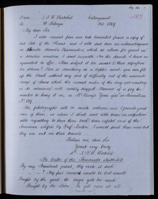 John Frederick William Herschel, Copy letter, from Sir John Herschel to William Selwyn, dated at Collingwood, 1869-10, HS/24/289, The Royal Society Archives, London, https://makingscience.royalsociety.org/items/hs_24_289/copy-letter-from-sir-john-herschel-to-william-selwyn-dated-at-collingwood, accessed on 10 December 2025