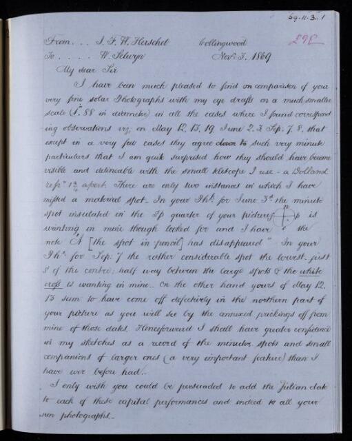 John Frederick William Herschel, Copy letter, from Sir John Herschel to William Selwyn, dated at Collingwood, 3 November 1869, HS/24/292, The Royal Society Archives, London, https://makingscience.royalsociety.org/items/hs_24_292/copy-letter-from-sir-john-herschel-to-william-selwyn-dated-at-collingwood, accessed on 10 December 2025