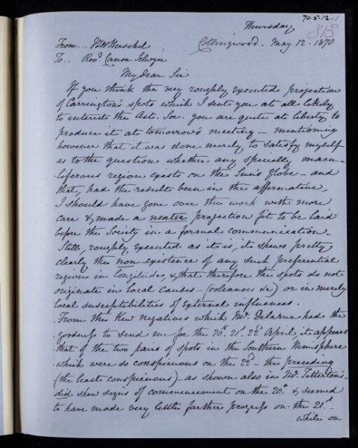 John Frederick William Herschel, Copy letter, from Sir John Herschel to William Selwyn, dated at Collingwood, 12 May 1870, HS/24/313, The Royal Society Archives, London, https://makingscience.royalsociety.org/items/hs_24_313/copy-letter-from-sir-john-herschel-to-william-selwyn-dated-at-collingwood, accessed on 10 December 2025
