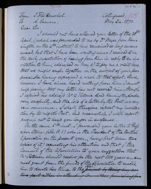 John Frederick William Herschel, Copy letter, from Sir John Herschel to Georg Adolph Erman, dated at Collingwood, 24 May 1870, HS/24/315, The Royal Society Archives, London, https://makingscience.royalsociety.org/items/hs_24_315/copy-letter-from-sir-john-herschel-to-georg-adolph-erman-dated-at-collingwood, accessed on 08 February 2026