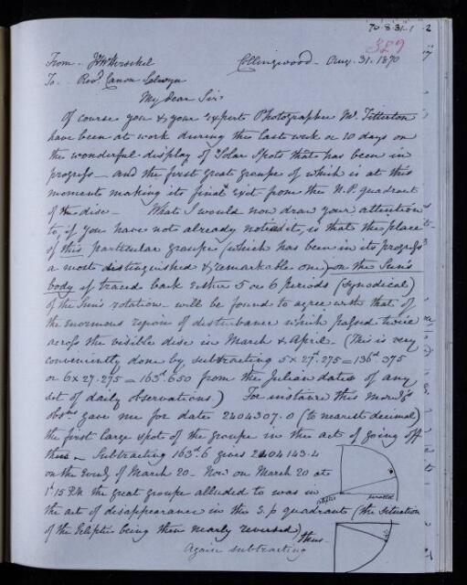 John Frederick William Herschel, Copy letter, from Sir John Herschel to William Selwyn, dated at Collingwood, 31 August 1870, HS/24/329, The Royal Society Archives, London, https://makingscience.royalsociety.org/items/hs_24_329/copy-letter-from-sir-john-herschel-to-william-selwyn-dated-at-collingwood, accessed on 10 December 2025