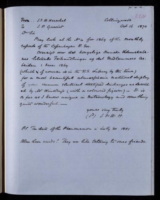 John Frederick William Herschel, Copy letter, from Sir John Herschel to John P. Gassiot, dated at Collingwood, 16 October 1870, HS/24/334, The Royal Society Archives, London, https://makingscience.royalsociety.org/items/hs_24_334/copy-letter-from-sir-john-herschel-to-john-p-gassiot-dated-at-collingwood, accessed on 14 February 2026