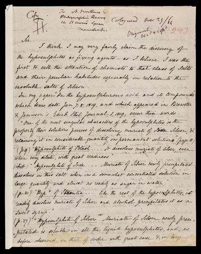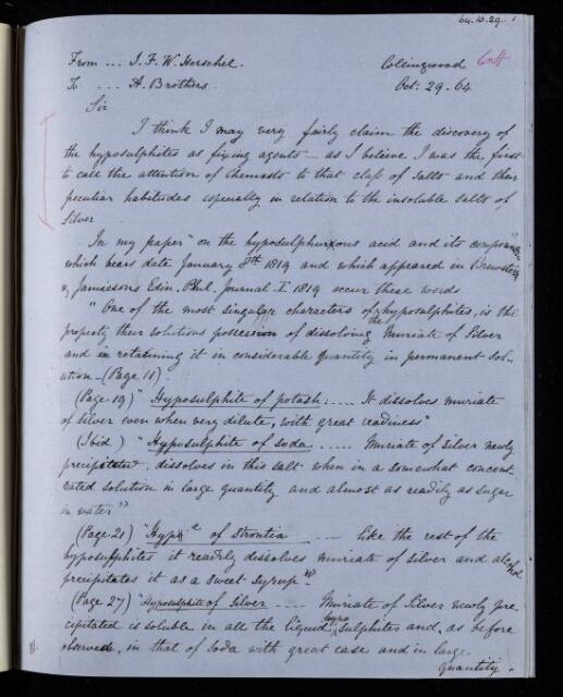 John Frederick William Herschel, Copy of draft letter, from Sir John Herschel to Alfred Brothers, dated at Collingwood, 29 October 1864, HS/24/64, The Royal Society Archives, London, https://makingscience.royalsociety.org/items/hs_24_64/copy-of-draft-letter-from-sir-john-herschel-to-alfred-brothers-dated-at-collingwood, accessed on 07 March 2026