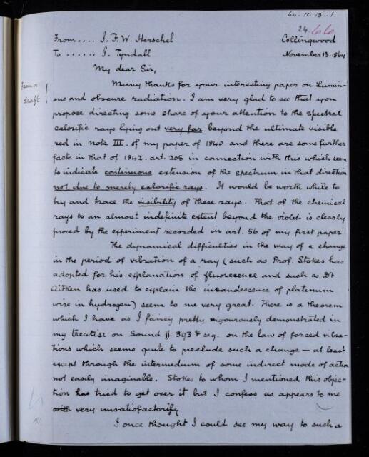 John Frederick William Herschel, Copy letter, from Sir John Herschel to John Tyndall, dated at Collingwood, 13 November 1864, HS/24/66, The Royal Society Archives, London, https://makingscience.royalsociety.org/items/hs_24_66/copy-letter-from-sir-john-herschel-to-john-tyndall-dated-at-collingwood, accessed on 11 March 2026