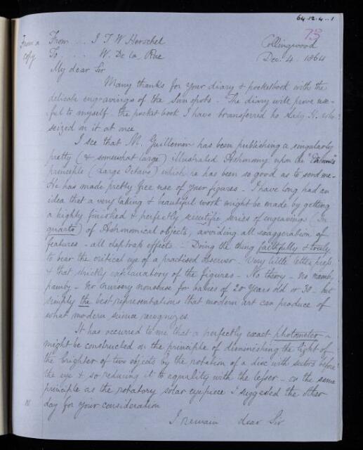 John Frederick William Herschel, Sir; John Frederick William Herschel, Copy of draft letter, from Sir John Herschel to Warren de La Rue, dated at Collingwood, 4 December 1864, HS/24/73, The Royal Society Archives, London, https://makingscience.royalsociety.org/items/hs_24_73/copy-of-draft-letter-from-sir-john-herschel-to-warren-de-la-rue-dated-at-collingwood, accessed on 12 November 2025