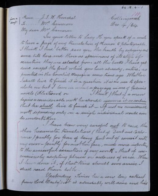 Copy of draft letter, from Sir John Herschel to Julia Margaret Cameron, dated at Collingwood