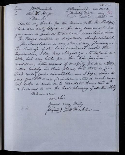 John Frederick William Herschel, Sir; John Frederick William Herschel, Copy letter, from Sir John Herschel to William Selwyn, dated at Collingwood, 1 January 1865, HS/24/80, The Royal Society Archives, London, https://makingscience.royalsociety.org/items/hs_24_80/copy-letter-from-sir-john-herschel-to-william-selwyn-dated-at-collingwood, accessed on 10 November 2025