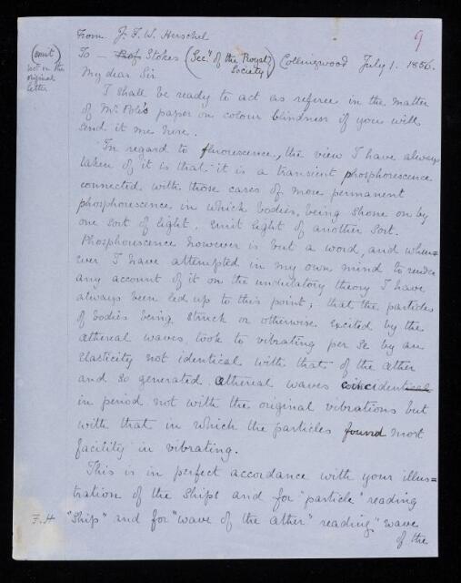 John Frederick William Herschel, Copy of a letter, from John Frederick William Herschel to George Gabriel Stokes, dated at Collingwood, 1 July 1856, HS/25/10/9, The Royal Society Archives, London, https://makingscience.royalsociety.org/items/hs_25_10_9/copy-of-a-letter-from-john-frederick-william-herschel-to-george-gabriel-stokes-dated-at-collingwood, accessed on 18 January 2026