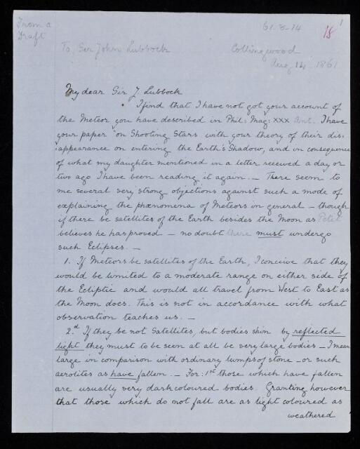 John Frederick William Herschel, Copy letter, from John Frederick William Herschel to John William Lubbock, dated at Collingwood, 15 August 1861, HS/25/15/18, The Royal Society Archives, London, https://makingscience.royalsociety.org/items/hs_25_15_18/copy-letter-from-john-frederick-william-herschel-to-john-william-lubbock-dated-at-collingwood, accessed on 23 January 2026