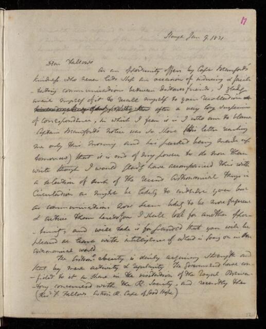 Contemporary copy in sender's hand, signed by sender. Brings FF up-to-date on astronomical news in England, and suggests that John Frederick William Herschel may come to the Cape.