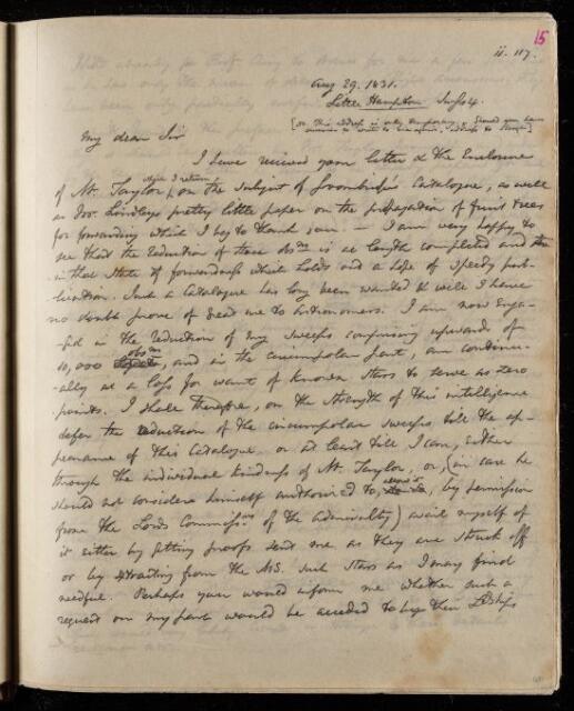 John Frederick William Herschel, Copy letter, from Sir John Herschel to Francis Beaufort, dated at Little Hampton, 29 August 1831, HS/25/2/15, The Royal Society Archives, London, https://makingscience.royalsociety.org/items/hs_25_2_15/copy-letter-from-sir-john-herschel-to-francis-beaufort-dated-at-little-hampton, accessed on 25 January 2026