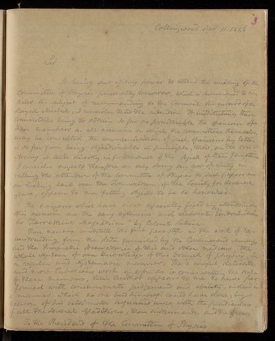 Copy of a letter, from John Frederick William Herschel, Collingwood to the Committee of Physics