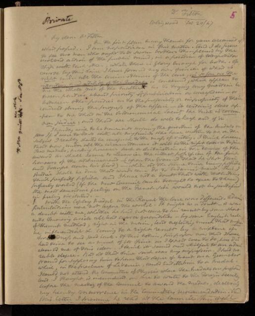 Contemporary copy in sender's hand, signed by sender. Expresses opinions about the medal fiasco at the Royal Astronomical Society, and in so doing, also defends G. B. Airy. John Frederick William Herschel is very concerned about the mean attacks being made on various people over the Neptune discovery controversy. Makes especially strong statements in a PS written on Feb. 21.