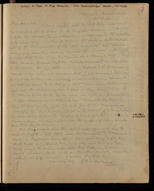 John Frederick William Herschel, Copy letter, from Sir John Herschel to Georg Adolph Erman, dated at Collingwood, 12 October 1870, HS/25/7/7, The Royal Society Archives, London, https://makingscience.royalsociety.org/items/hs_25_7_7/copy-letter-from-sir-john-herschel-to-georg-adolph-erman-dated-at-collingwood, accessed on 23 January 2026