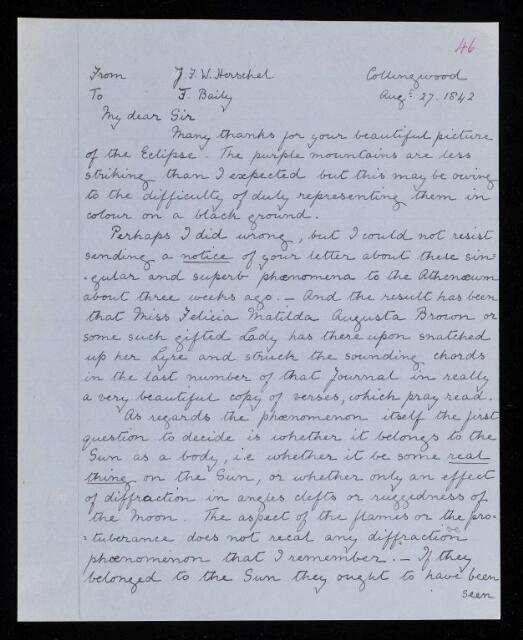 John Frederick William Herschel, Copy of a letter, from John Frederick William Herschel to Francis Baily, dated at Collingwood, 27 August 1842, HS/25/8/46, The Royal Society Archives, London, https://makingscience.royalsociety.org/items/hs_25_8_46/copy-of-a-letter-from-john-frederick-william-herschel-to-francis-baily-dated-at-collingwood, accessed on 21 January 2026