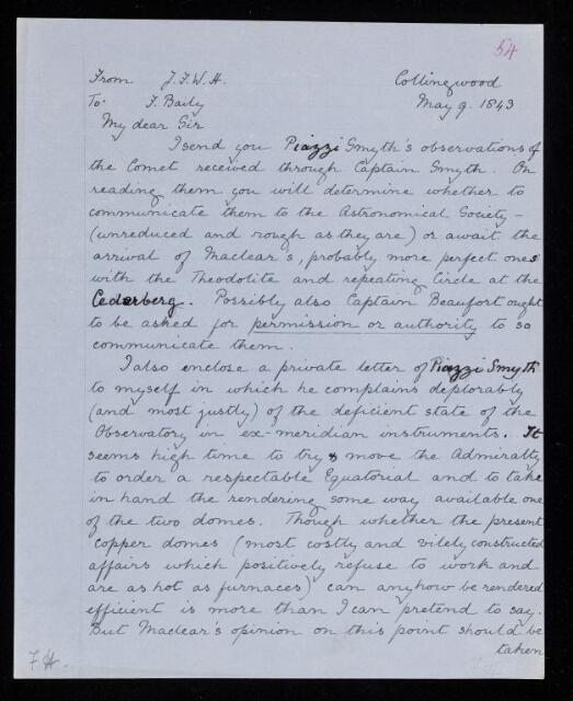 John Frederick William Herschel, Copy of a letter, from John Frederick William Herschel to Francis Baily, dated at Collingwood, 9 May 1843, HS/25/8/54, The Royal Society Archives, London, https://makingscience.royalsociety.org/items/hs_25_8_54/copy-of-a-letter-from-john-frederick-william-herschel-to-francis-baily-dated-at-collingwood, accessed on 17 March 2026