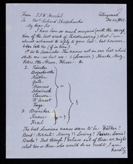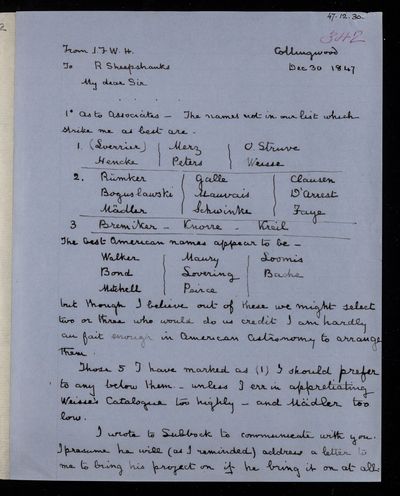 John Frederick William Herschel, Incomplete copy of a letter, from John Frederick William Herschel to Richard Sheepshanks, dated at Collingwood, 30 December 1847, HS/25/9/49, The Royal Society Archives, London, https://makingscience.royalsociety.org/items/hs_25_9_49/incomplete-copy-of-a-letter-from-john-frederick-william-herschel-to-richard-sheepshanks-dated-at-collingwood, accessed on 24 January 2026