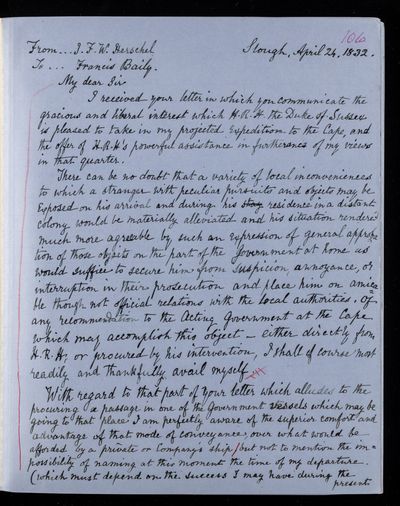 John Frederick William Herschel, Sir; John Frederick William Herschel, Letter, from Sir John Herschel to Francis Baily, dated at Slough, 24 April 1832, HS/3/110, The Royal Society Archives, London, https://makingscience.royalsociety.org/items/hs_3_110/letter-from-sir-john-herschel-to-francis-baily-dated-at-slough, accessed on 13 November 2025